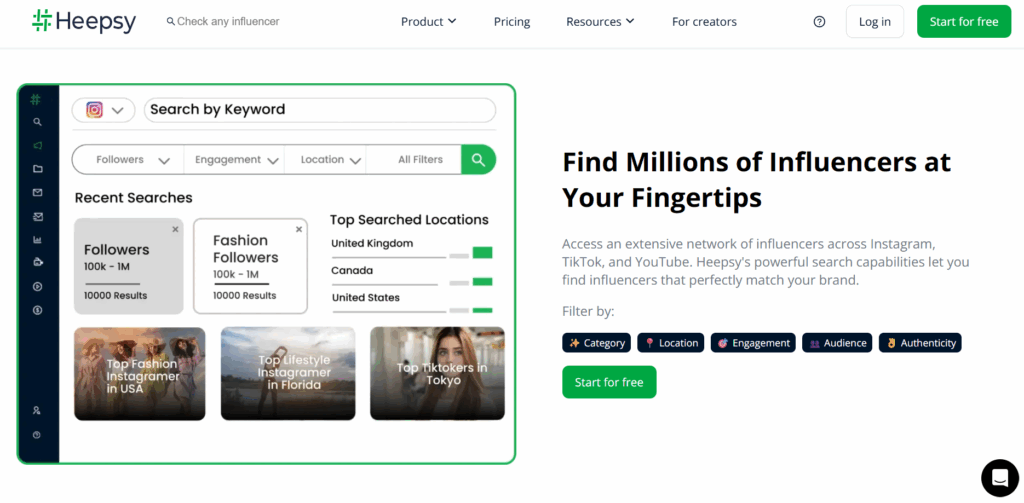 Heepsy is a user-friendly influencer marketing platform designed for brands looking to discover Instagram, YouTube, TikTok, and Twitch influencers based on specific filters like audience size, engagement rate, location, and niche. It’s perfect for narrowing down creators that align with your influencer marketing strategy.